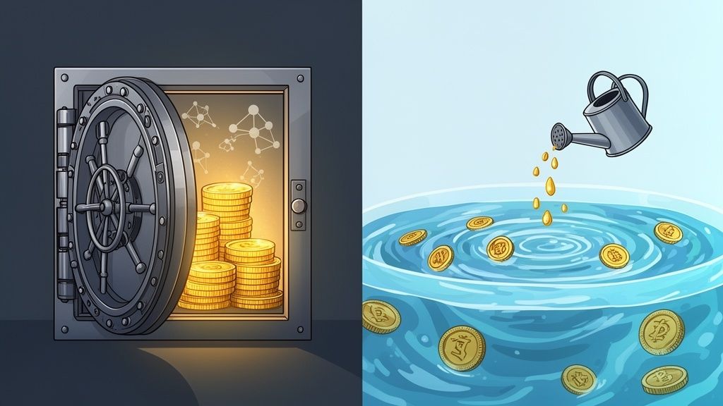 When you're figuring out where to put your crypto to work, the staking vs yield farming debate is one of the first you'll encounter. Here’s the simplest way to think about it: staking is like earning interest in a high-yield savings account—it's generally stable, predictable, and lower-risk. Yield farming is like active, high-risk, high-reward investing. You're chasing much bigger returns, but that comes with a lot more complexity and danger.