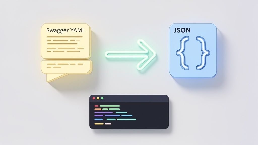 Converting your Swagger or OpenAPI spec to JSON is about creating a single, machine-readable blueprint for your API. While most developers prefer writing API contracts in YAML—its clean syntax and comment support are hard to beat—the wider API ecosystem is built on the strict, universal structure of JSON.